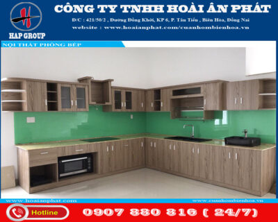 - Cánh tủ bếp: sử dụng cánh có lõi MDF lõi xanh phủ Melamine được gia công bởi An Cường hoặc tấm nhập khẩu từ Thái Lan